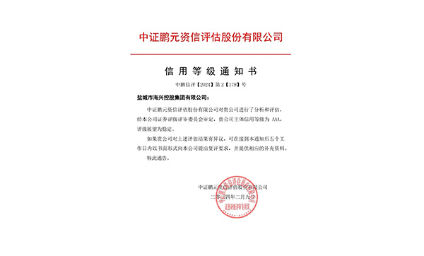 2月9日,中證鵬元資信評估股份有限公司發布《信用等級通知書》中鵬信評【2024】第Z【179】號,確定鹽城市海興控股集團有限公司主體信用等級為 AAA,評級展望為穩定。2024-02-09 -