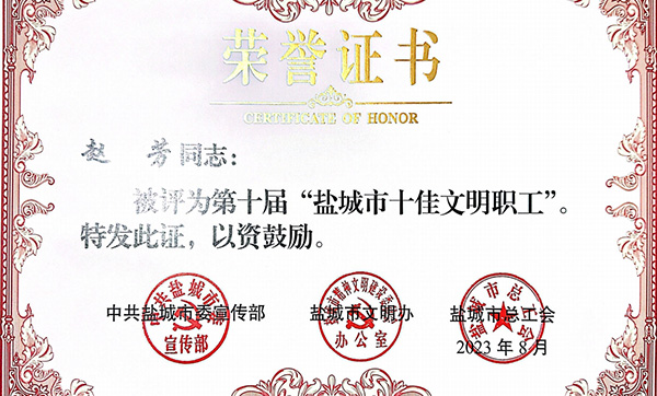 喜訊傳來!近日,海興集團港城公司趙芳同志榮獲中共鹽城市委宣傳部、鹽城市文明辦、鹽城市總工會頒發(fā)的第十屆“鹽城市十佳文明職工”稱號和鹽城市總工會頒發(fā)的&l2023-12-04 -